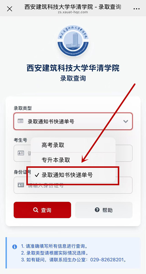 (2)选择“录取通知书快递单号”,准确输入相应信息进行查询。
