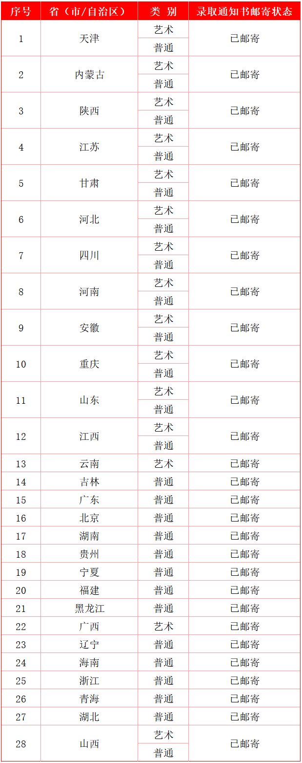 同时,浙江、湖北、天津、青海及山西等多个省份的普通类录取通知书现已邮寄,详情请见下表: