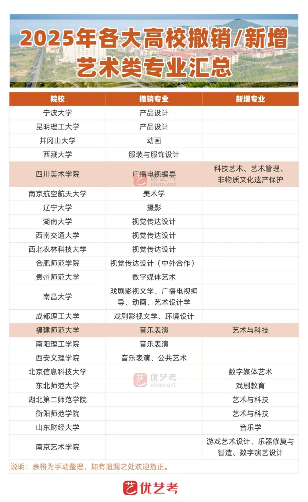 近期,多所高校宣布撤销艺术类专业,宁波大学和昆明理工大学相继宣布撤销产品设计专业,也有部分高校宣布增设部分艺术类专业如福建师范大学宣布增设艺术与科技专业。优艺考整理了近期宣布撤销或新增的高校艺术类专业。