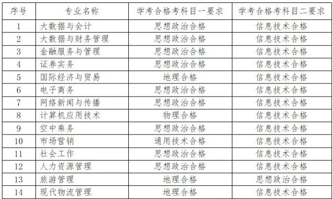 各专业所需普通高中学业水平合格性考试科目要求如下表: