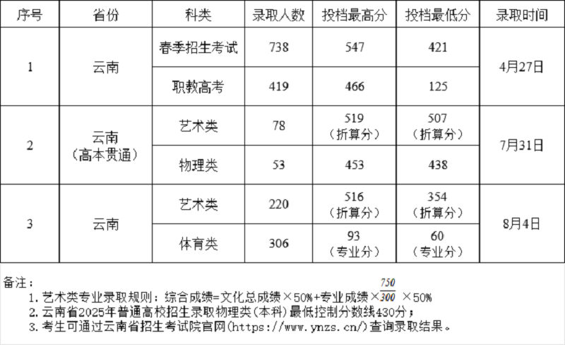 根据2025年各省、自治区招生考试委员会办公室(考试院)招生录取流程安排。截止2025年8月4日,我校已完成云南省(春季招生考试、职教高考、高本贯通、艺术体育类)的录取工作,录取批次:高职(专科),学制:三年。 具体分省分科类录取情况如下: