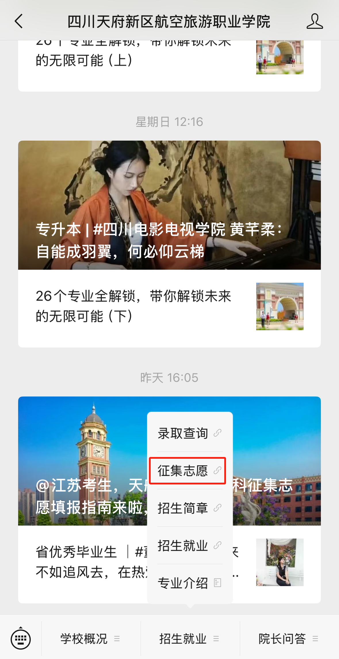 关注“四川天府新区航空旅游职业学院”官方公众号;