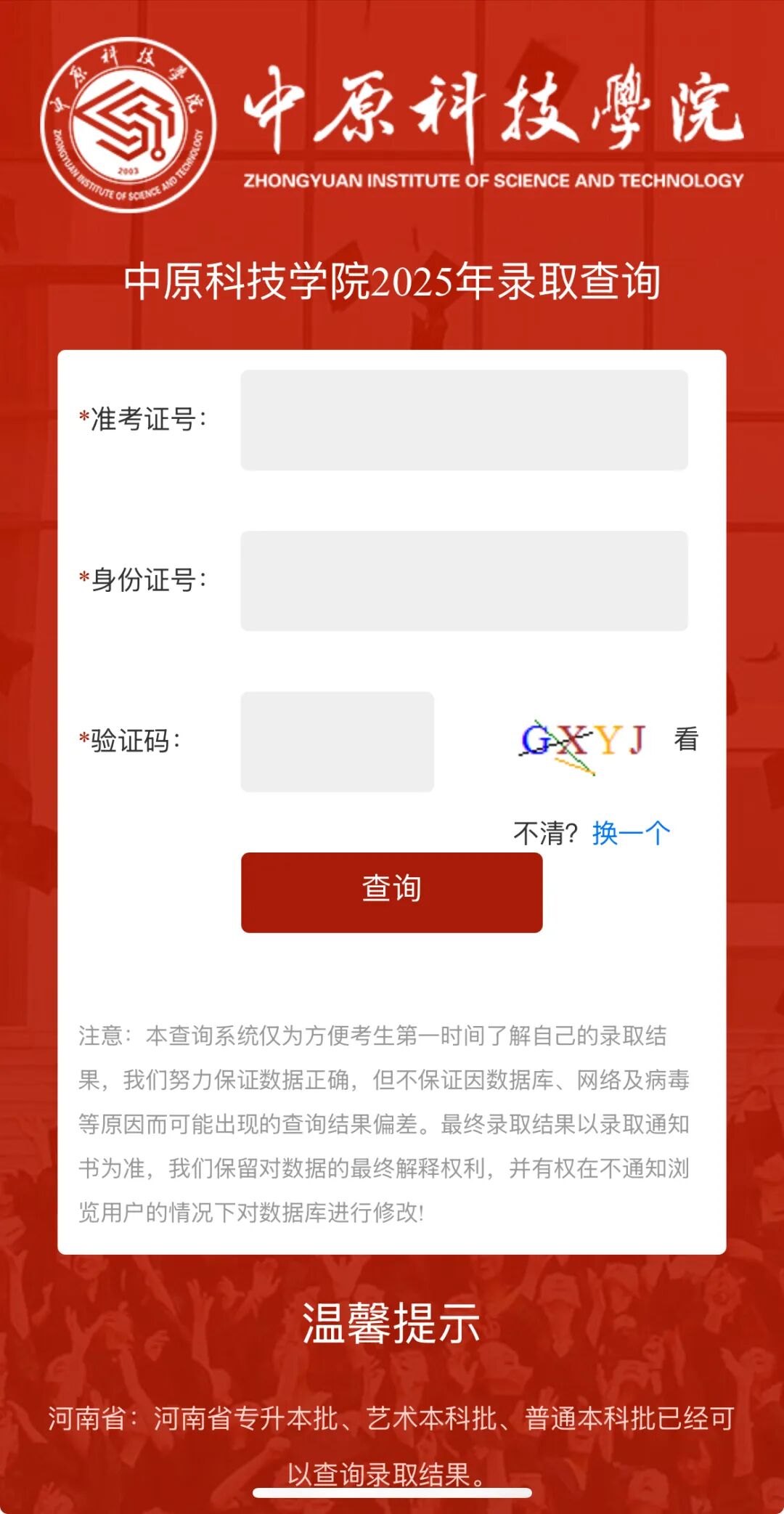我校已圆满完成2025年河南省普通本科批及河北、陕西、安徽、四川、江西、湖南、海南、青海等九个省份的本科批录取工作,请报考考生及时查询录取结果,查询方式如下: