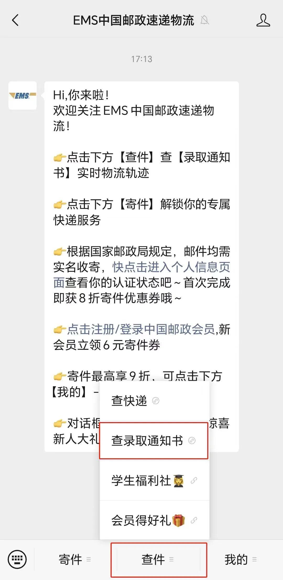 考生可以通过“EMS中国邮政速递物流微信公众号”查件(查录取通知书)窗口输入考生号查询邮件状态。