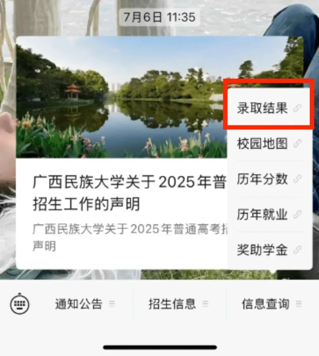 可点击广西民族大学招生信息微信公众号右下角信息查询-录取查询,即可在手机上查询录取通知书单号。