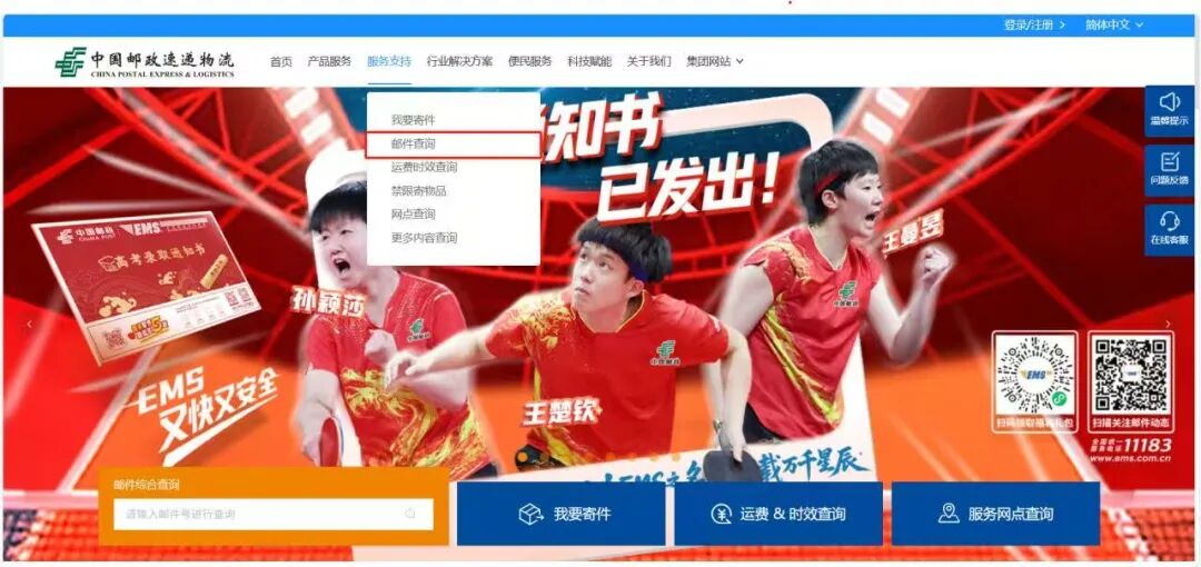 登录EMS全国邮政特快专递官方网站,点击首页的“服务支持”→“邮件查询”→“录取通知书查询”,可根据准考证号/考生号/收件人电话号码,任选其一查询快递物流信息。网址:http://www.ems.com.cn