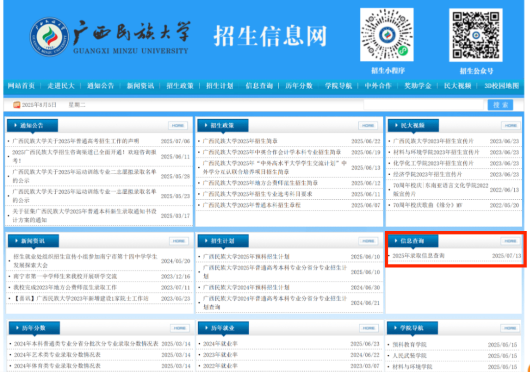 搜索进入广西民族大学招生信息网官方网站,点击首页的“信息查询”→“2025年录取信息查询”可根据姓名/身份证号/验证码,查询录取通知书快递物流单号。