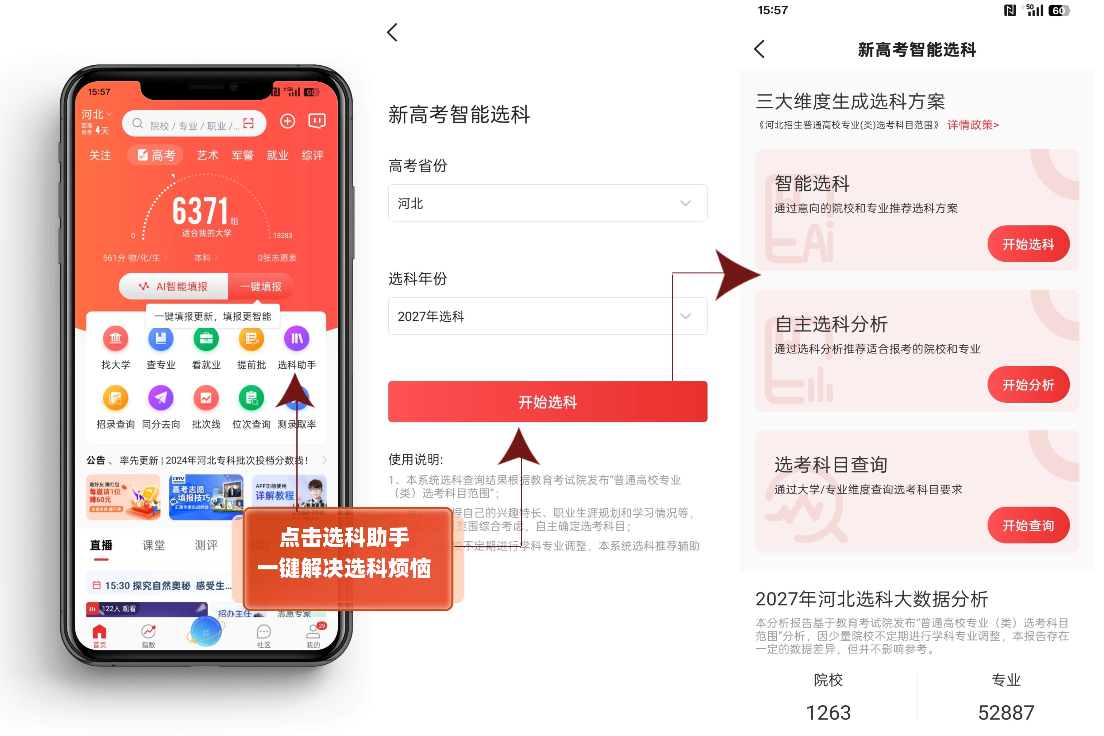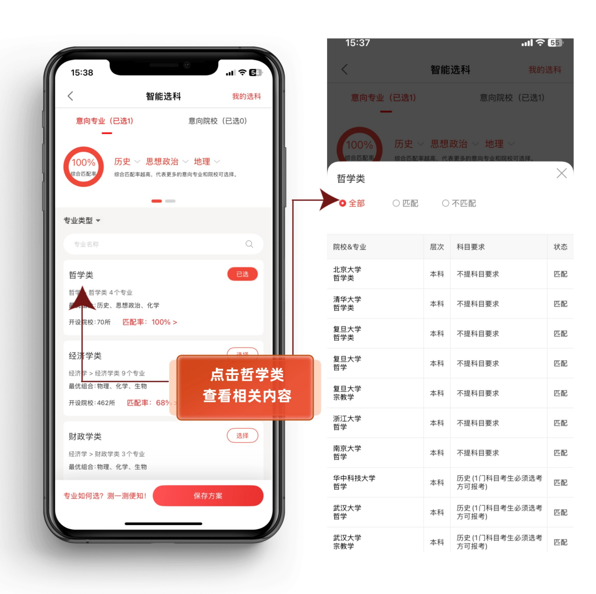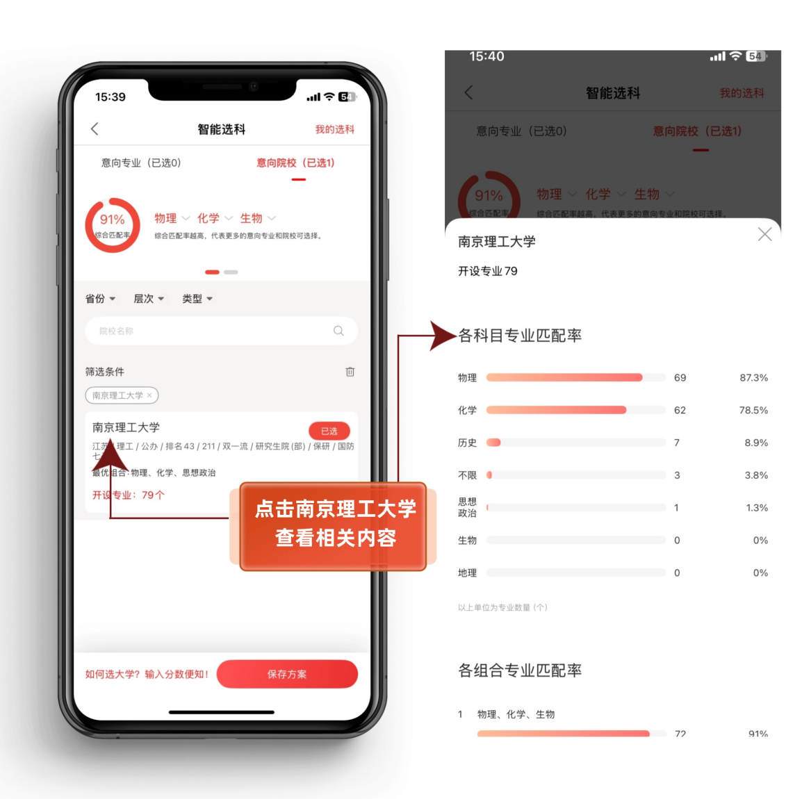 在选科时,可以使用优志愿APP【选科助手】功能,从智能选科维度出发,通过意向专业或意向院校反向推导选科方案,为学生提供双维度决策支持。