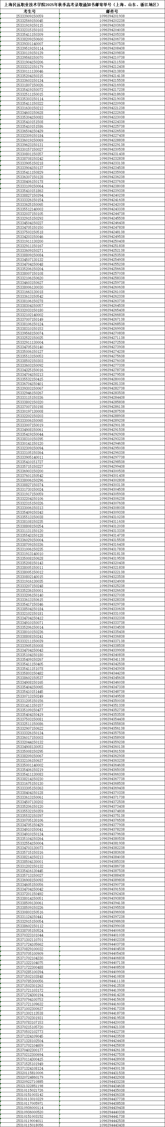 上海民远职业技术学院2025年秋季高考录取通知书邮寄单号(上海、山东、浙江地区)
