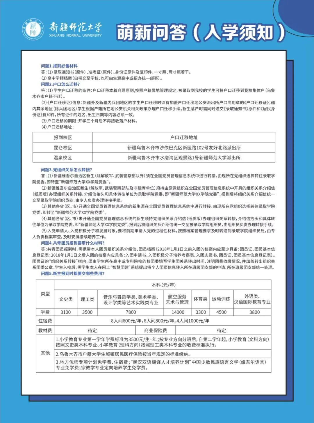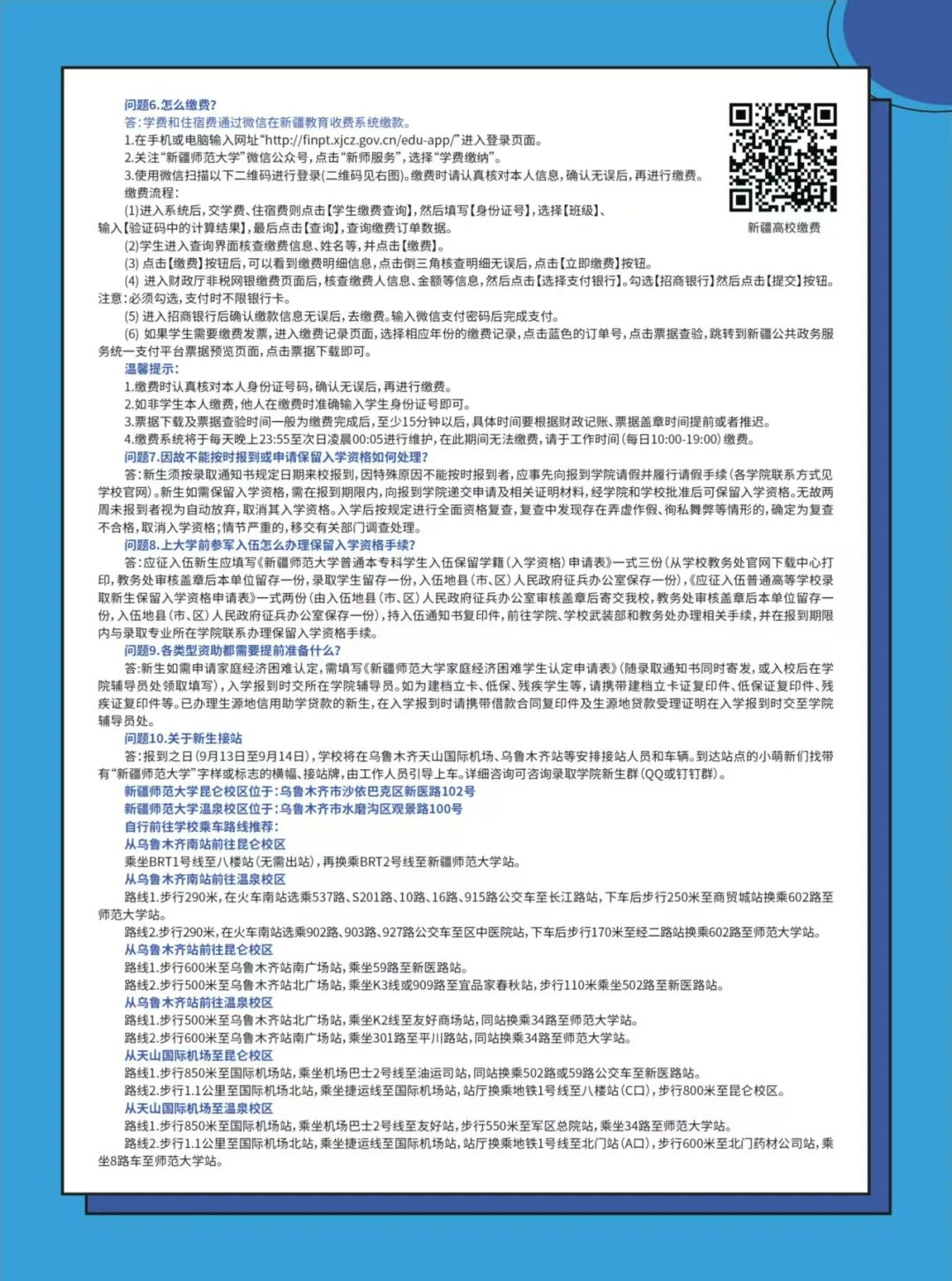 报到之日(9月13日至9月14日),学校将在乌鲁木齐天山国际机场、乌鲁木齐站等安排接站人员和车辆。到达站点的小萌新们找带有“新疆师范大学”字样或标志的横幅、接站牌,由工作人员引导上车。详细咨询可咨询录取学院新生群(QQ或钉钉群)。