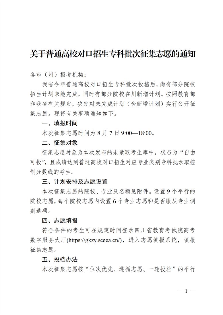 关于普通高校对口招生专科批次征集志愿的通知