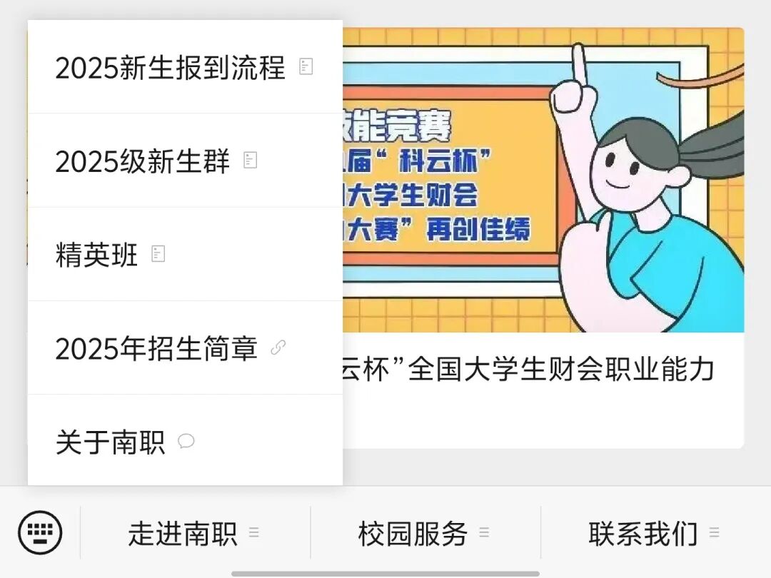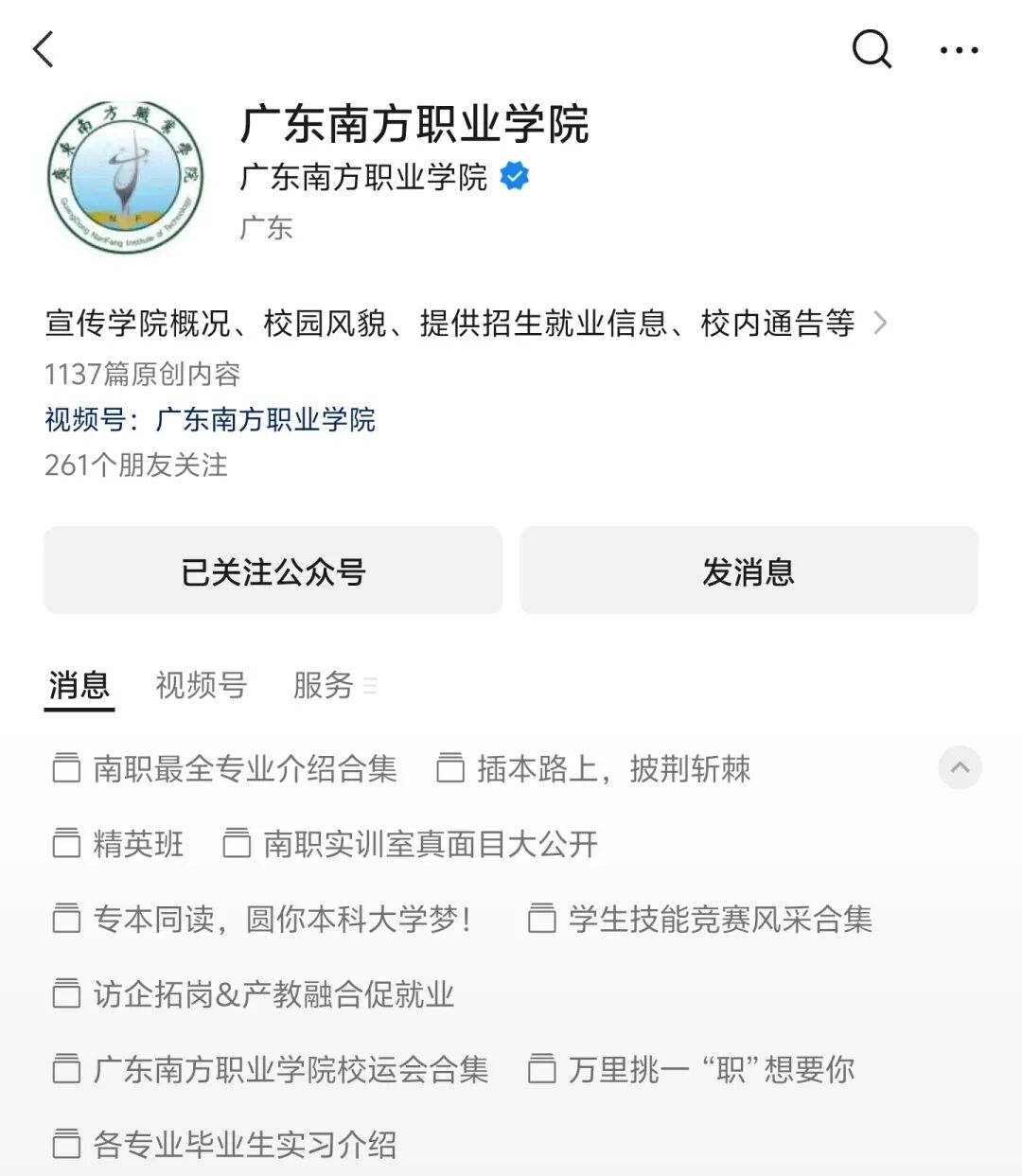 关注 “广东南方职业学院” 公众号,搜索往期推文记录,就能看到分类清晰的学院以及专业介绍、新生攻略、校园美景、以及各种校内活动新闻等等。