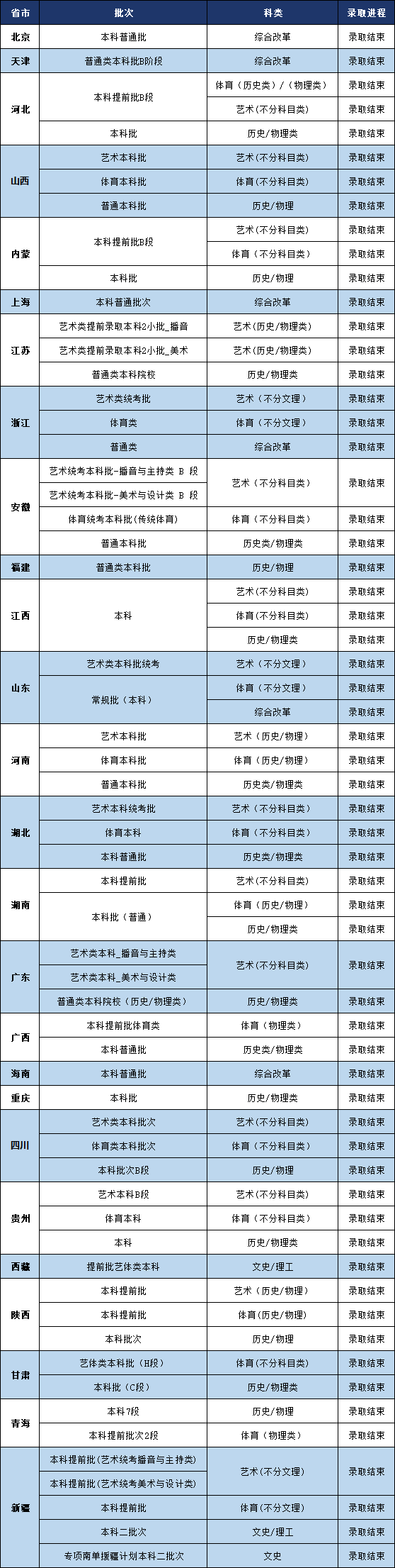 同学们可通过下表查看我校在各省录取进程和录取结果。