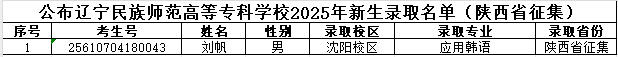 公布辽宁民族师范高等专科学校2025年新生录取名单(陕西省征集)