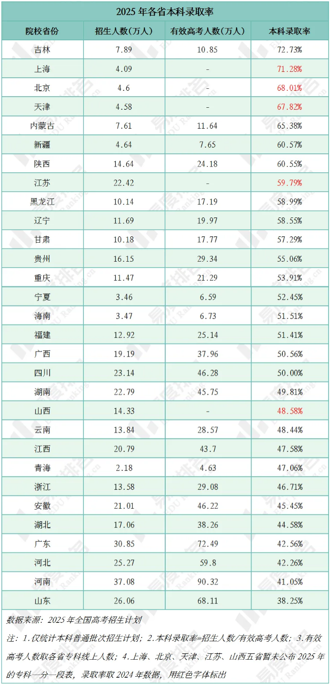 当2025年高考志愿填报的尘埃落定,一组组看似枯燥的数据正在悄悄改写大众对高考的固有认知:河南以37万招生计划登顶 "招生第一省",却深陷41%录取率的困境;吉林72.73%的本科录取率意外超越京津沪,打破 "直辖市高考更容易" 的常识……