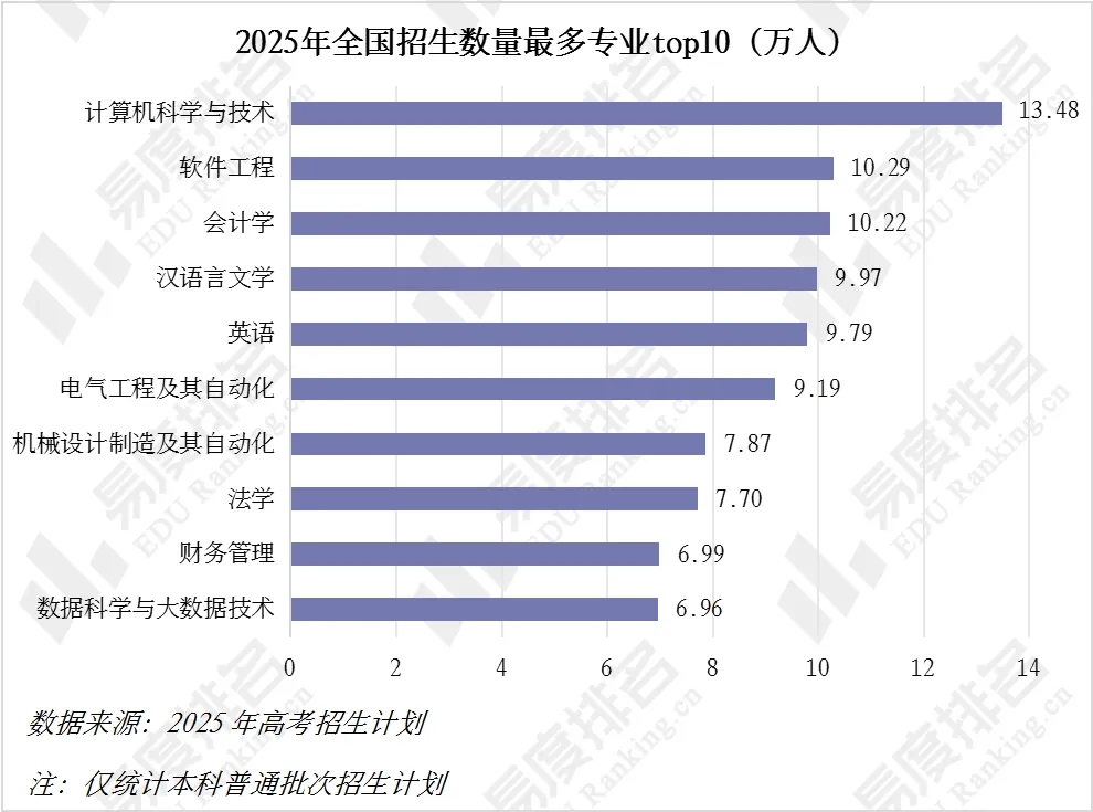 数字经济浪潮席卷高校,计算机科学与技术专业以13.5万招生量登顶,加上软件工程、数据科学等,信息技术类专业总规模突破30万人,占TOP10专业总量的43%。