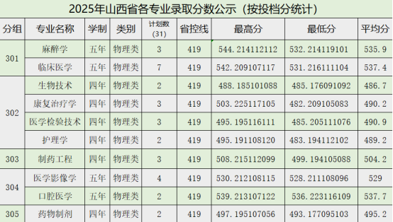 牡丹江医科大学2025年山西省各专业录取分数公示(按投档分统计)