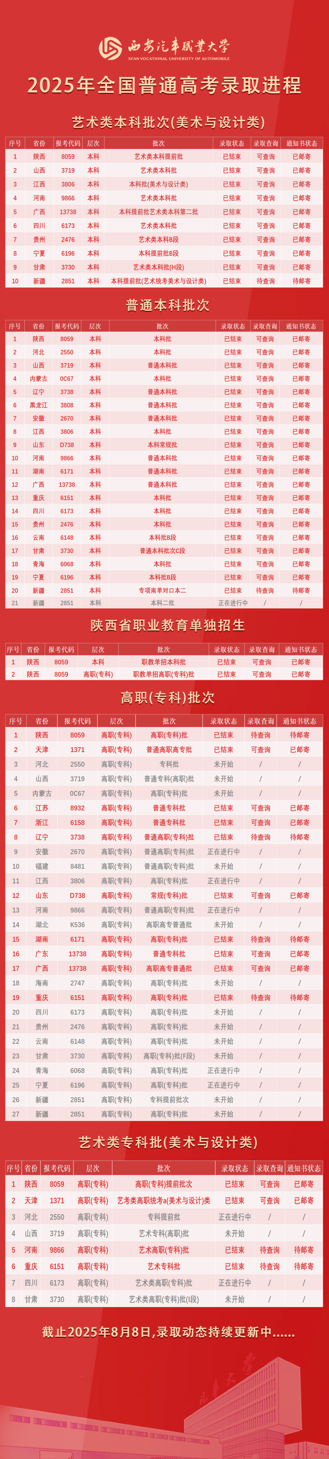 录取快讯 | 截止2025年8月8日,西安汽车职业大学最新录取进程!