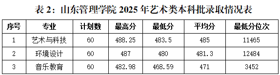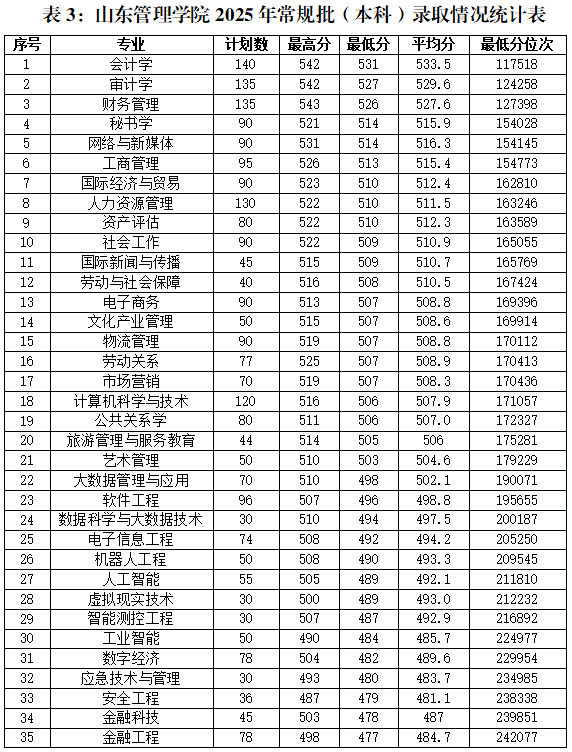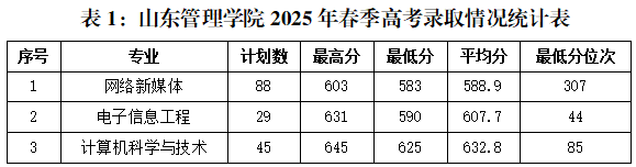 2025年,我校山东省内普通类本科招生专业共计35个,新增本科专业6个,其余的29个专业中有26个平均分比去年有提高,13个专业的最低分位次较2024年有明显提升,生源质量进一步提高。春季高考本科、艺术类本科录取分数和录取位次持续稳步上升。具体录取情况详见下表1-3。