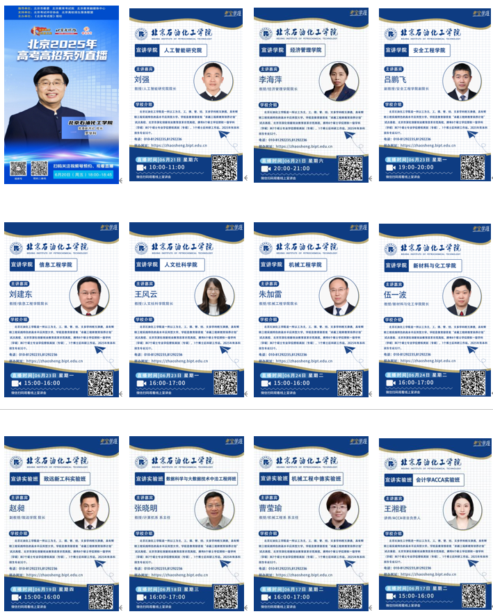 2025年,为帮助广大考生深入了解学校,明晰报考政策和专业特点,学校充分发挥新媒体优势,开展多渠道、多维度的招生宣传工作。线上宣传积极搭建权威宣讲平台,持续开展“校长说学校-院长说学院-教授说专业”招生宣传直播。通过北京考试报视频号、高考宝、教育头条、教育面对面、北京石油化工学院招办视频号、学而思、腾讯教育等共开展线上直播60余场。