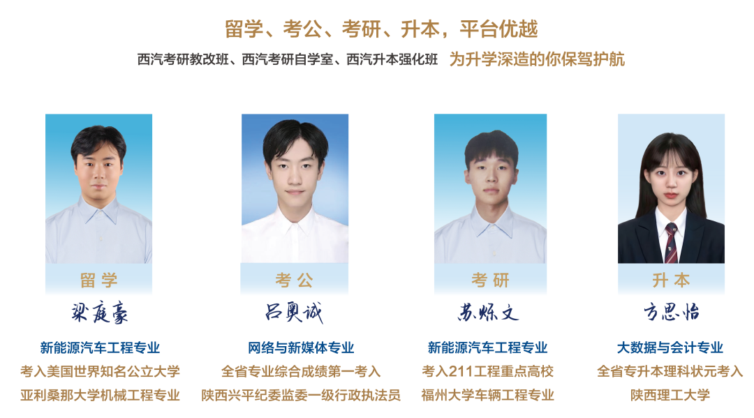 在西汽,我们为心怀壮志的学子铺设了多元的进阶之路:双导师护航(学术引路人+行业实践家),让车间淬炼的真知灼见,成为你奔赴更高平台的“硬核底气”;自习室长明的灯、校企共研的课题、考场中从容讲述的实操案例、服务基层的扎实历练、跨国交流的广阔视野……这里不设限职业与发展的边界,只相信深耕技术的手,既能执笔写就学术新章,也能扎根基层服务社会,更能扬帆远航探索世界!无论考研、考公、留学还是专升本,西汽助你成就高光人生!