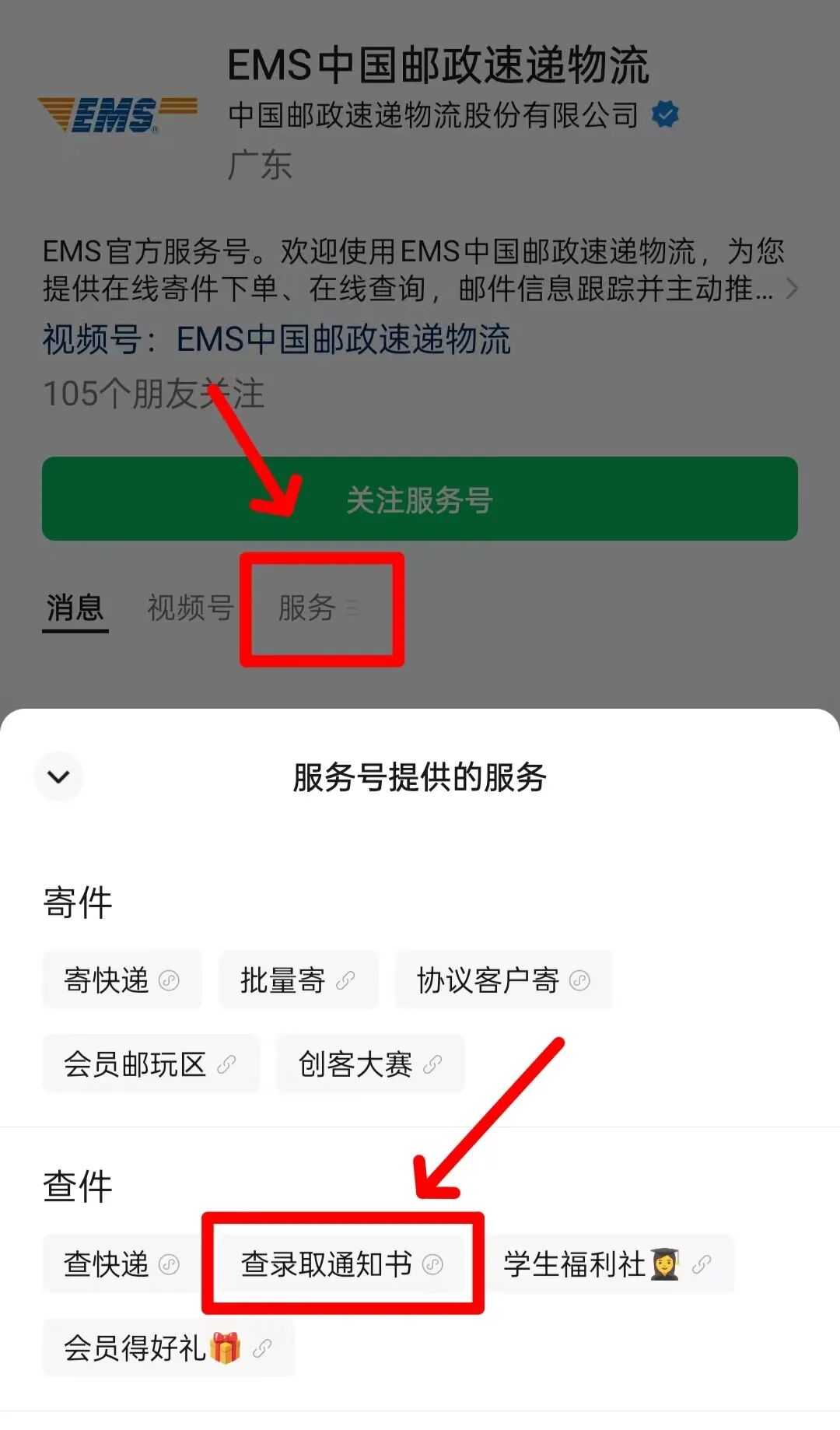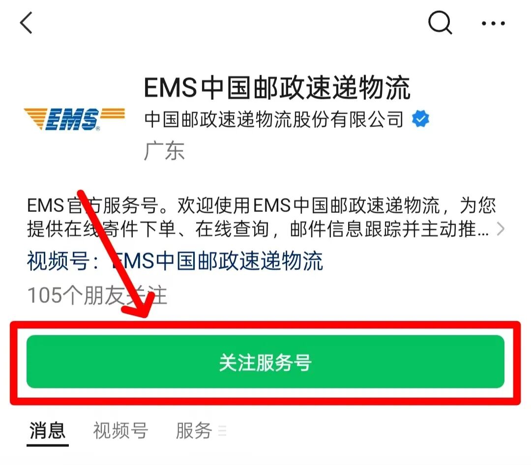 关注EMS中国邮政速递物流服务号