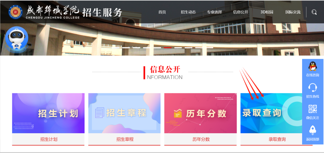 为便于广大考生、家长及时了解我校招生录取状态,我校2025年各省各批次录取结果将在官方公众号锦城招生发布。