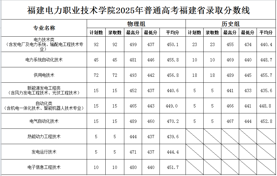 福建电力职业技术学院2025年普通高考福建省录取分数线