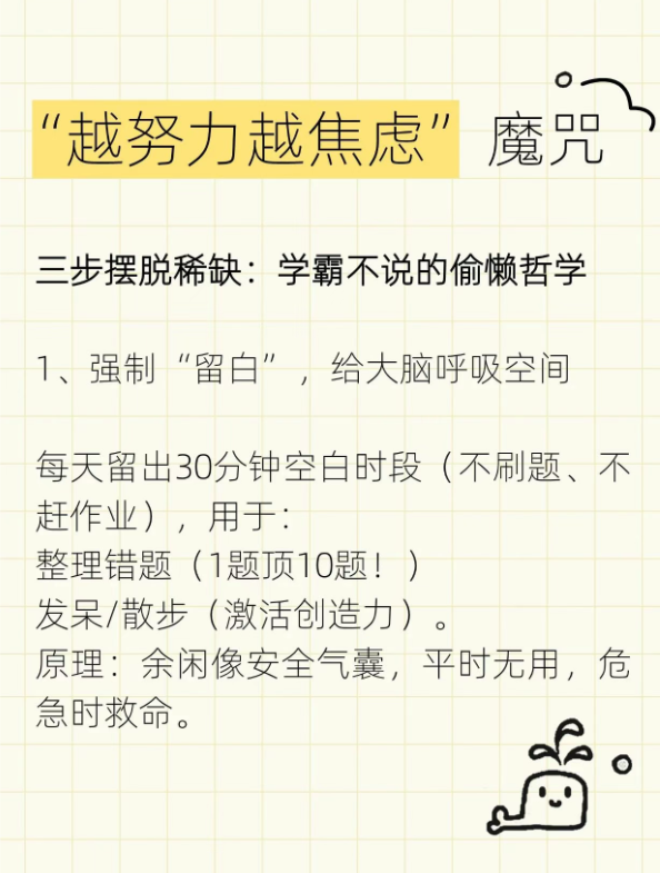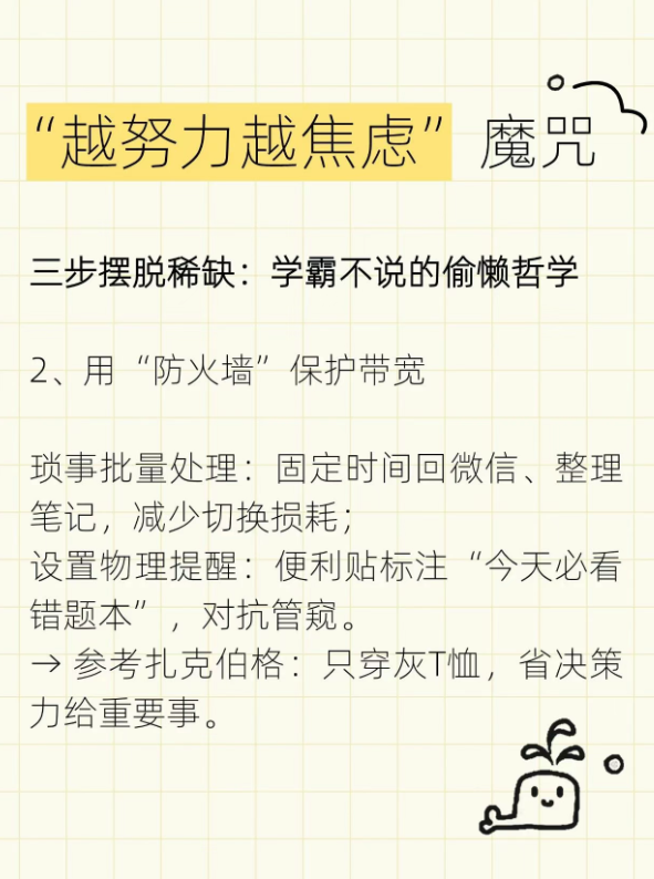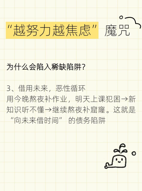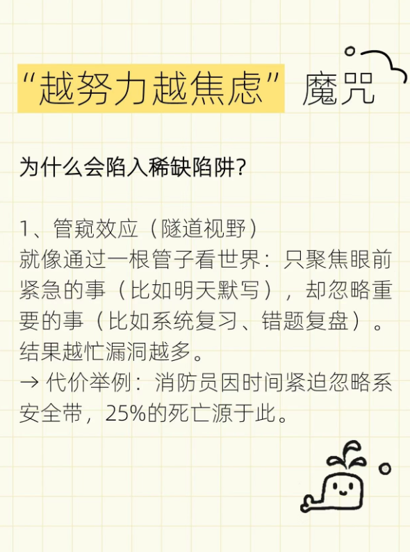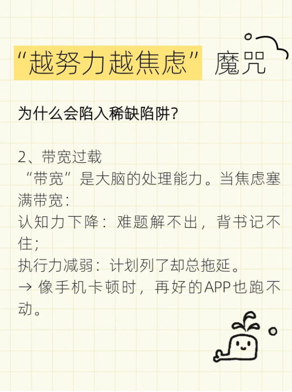 什么是稀缺心态?想象你的大脑是一部手机:当内存被焦虑占满(比如明天要交的作业、下周的考试),你就无法运行其他重要程序(比如复习计划、课外兴趣)。这种“越缺什么,越只盯着什么” 的状态,就是稀缺心态。