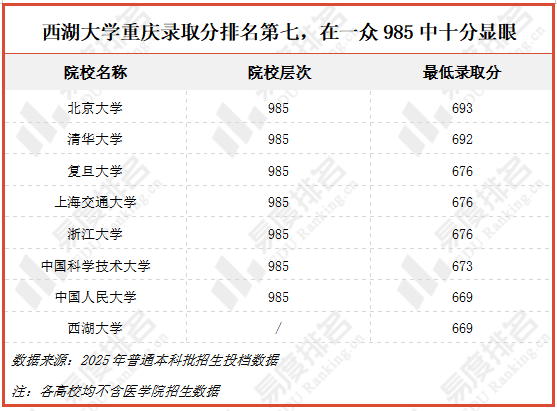西湖大学今年在重庆物理普通批招生的最低分为669分,在各院校中与中国人民大学并列第7位,在一众985高校中,西湖大学十分显眼。