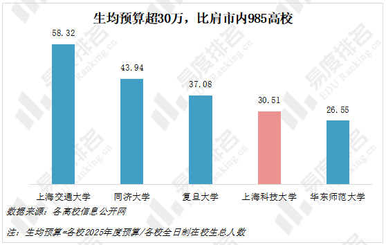 预算总额虽少,但由于其办学规模小,生均预算达到30.51万元,远超其他三所预算更多的市属高校,与上海市内的4所985强校也能掰掰手腕。充足的经费是教学和科研工作强有力的保障,同时也能为师生提供舒适的学习和生活环境。