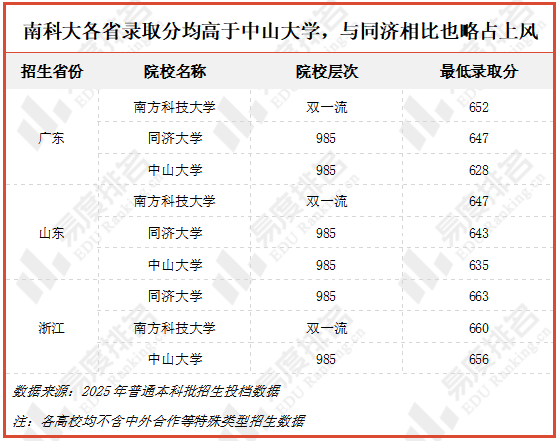 南方科技大学今年在广东、山东、浙江3省普通批招生,各省的录取分比中山大学还高,与同济大学相比也只有浙江的录取分低了3分。南方科大名气远不及这两所985强校,录取分却比这两所学校还高,实在是出乎预料!