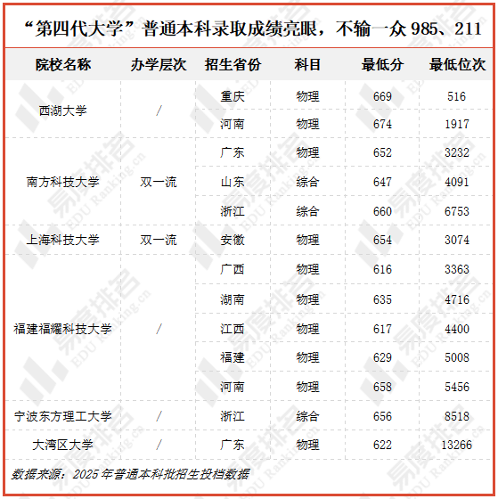 2025年高考本科批招生已落下帷幕,一些新成立的年轻大学在众多高校中脱颖而出,其中西湖大学尤为亮眼,其在重庆的录取分达到669分,分数比厦门大学、南开大学等众多顶尖强校还高。这些新兴高校录取分数之高,不输一众985、211高校,新型大学的迅速崛起,也意味着传统的985、211高校地位正被“第四代大学”所取代。
