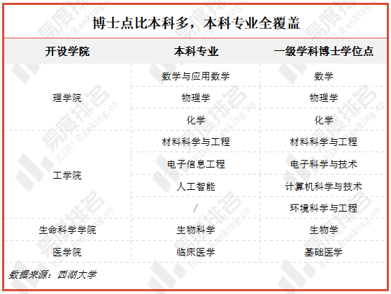 西湖大学在学生教育方面也不走寻常路,成立之初便开始招收博士生研究生,目前已拥有9个学术学位一级学科博士学位授权点。本科专业目前有8个,各专业均有对应的博士学位点,本科生想要留校读博,均有对口的专业供其继续深造。