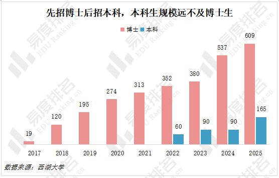 西湖大学实行精英化教育,招生规模小,且以博士培养为主。2017年开始招收联合培养博士生,2022年开始独立招收博士生,同年开始招收本科生,今年首次在普通本科批招生,本科招生规模远不及博士招生。