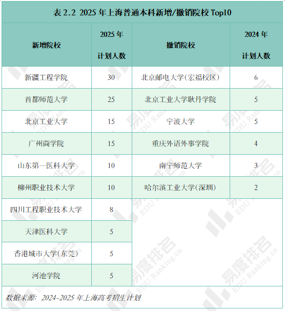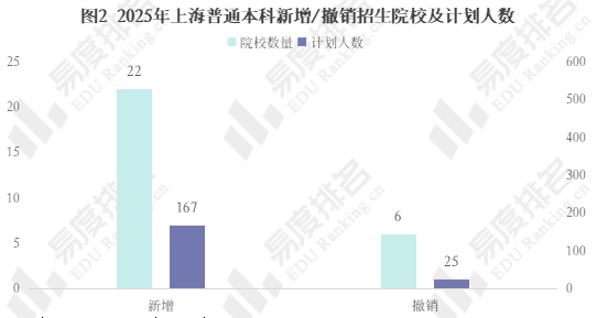 相比去年,今年新增22所高校在上海招生,新增院校计划招生167人。撤销招生计划的院校有6所,这6所高校去年的招生计划为25人。
