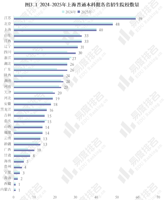 今年上海市内招生院校达到40所,市内高校计划招生人数达到3.12万人,较去年增加超6700人,市内院校计划人数占比达到76.41%;今年市外江苏的招生院校数最多,达到59所。