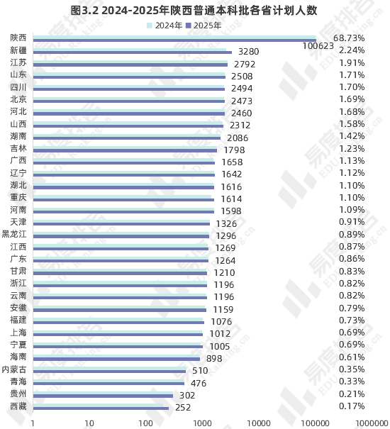 今年陕西本省招生的院校数最多,达到60所,在各省中排名第1位。陕西省内高校计划招生人数达到10万人,省内院校计划人数占比达到68.7%。除内蒙古、河北以外,各省的招生计划相比去年均增长。
