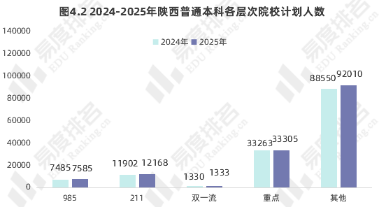 近两年在陕西招生的重点以上层次院校数量基本稳定,各层次院校的招生计划则继续保持增长趋势,但985、211高校的计划占比则有所下降,其中985高校的计划占比从去年的5.25%降至5.18%,211高校则从9.1%降至8.88%。高层次高校的名额竞争更加激烈。