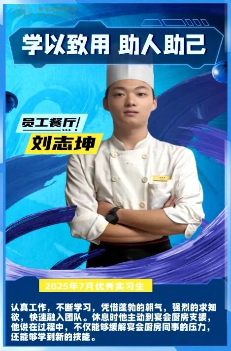 我校23级中餐烹饪班学生刘志坤,今年7月中旬进入郑州市嘉锦酒店管理有限公司实习,仅一个月就因吃苦耐劳、应变灵活,获评“优秀实习生”。酒店王主管这样评价:“刘志坤是个年轻有活力的小伙子。他在岗位上认真履职,业余时间坚持学习;宴会繁忙时还主动申请去宴会厨房支援,说既能帮同事分担压力,又能学到员工餐厅之外的技能。”刘志坤也计划明年留在岗位,一步一个脚印踏实就业。