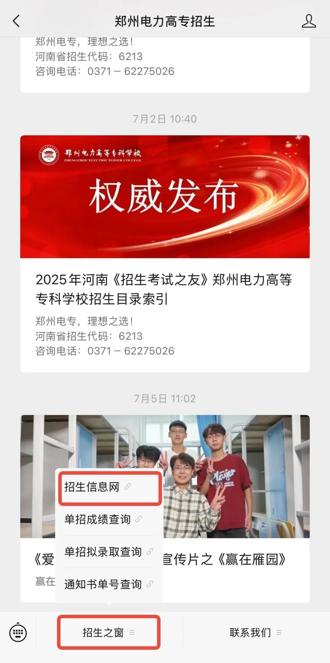搜索“郑州电力高专招生”或扫描下方二维码关注学校官方招生微信公众平台。