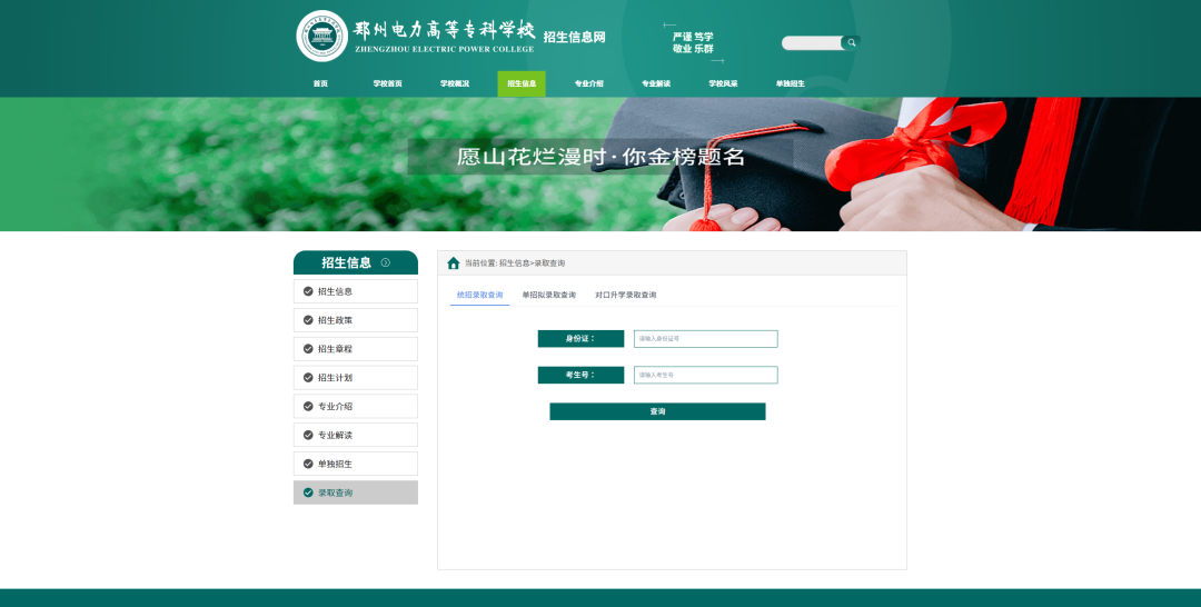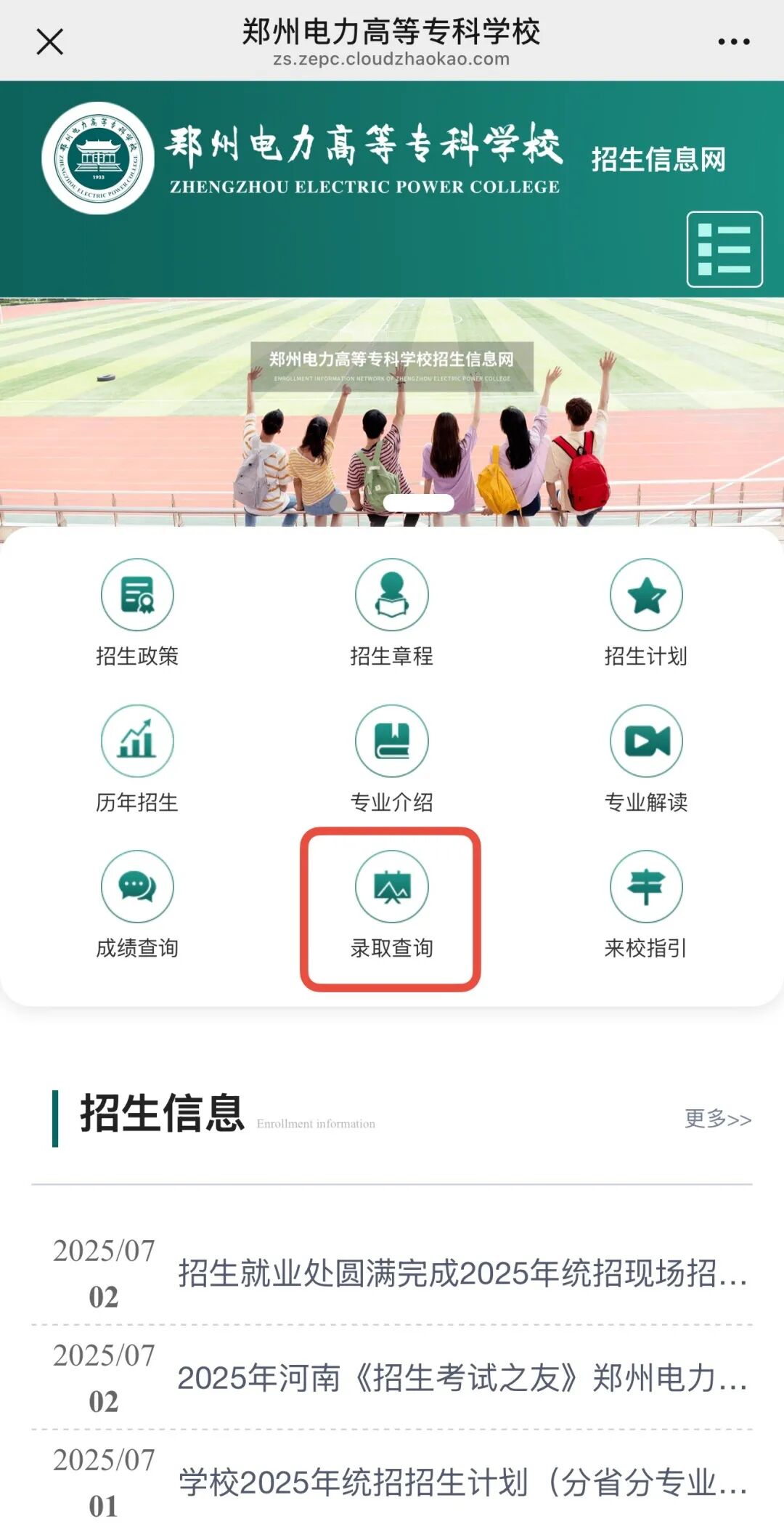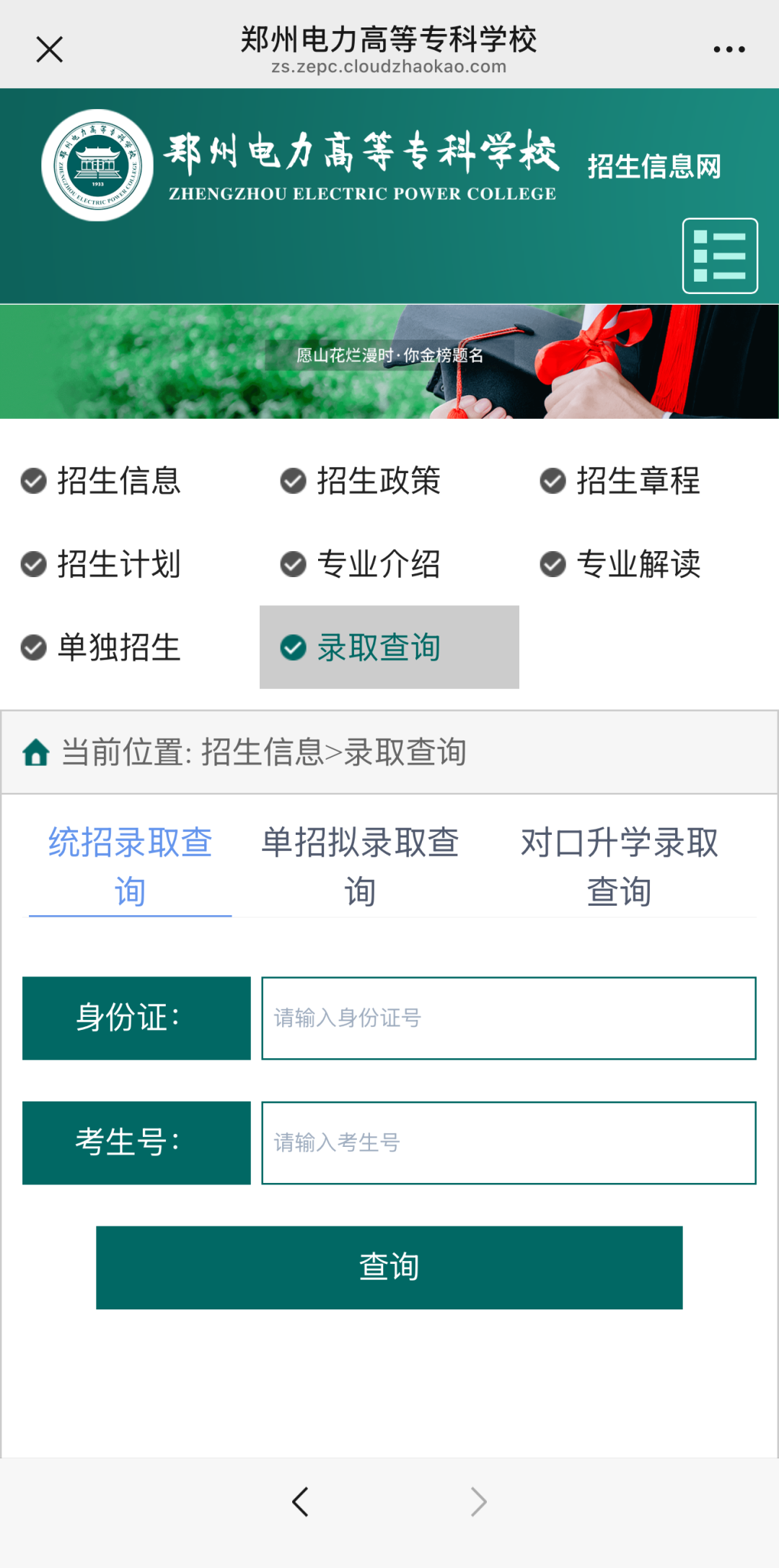 进入郑州电力高等专科学校招生信息网 ,在首页点击“录取查询”按钮。