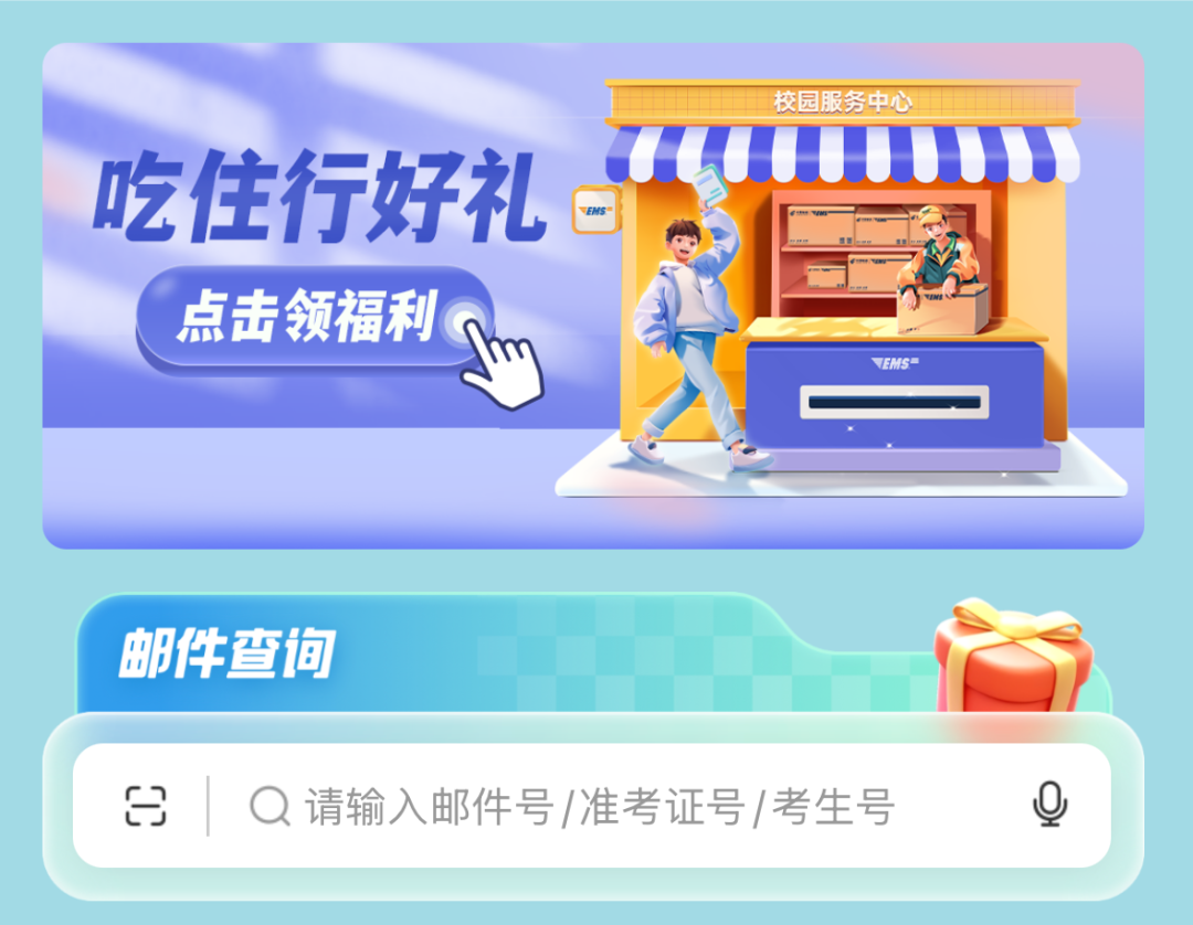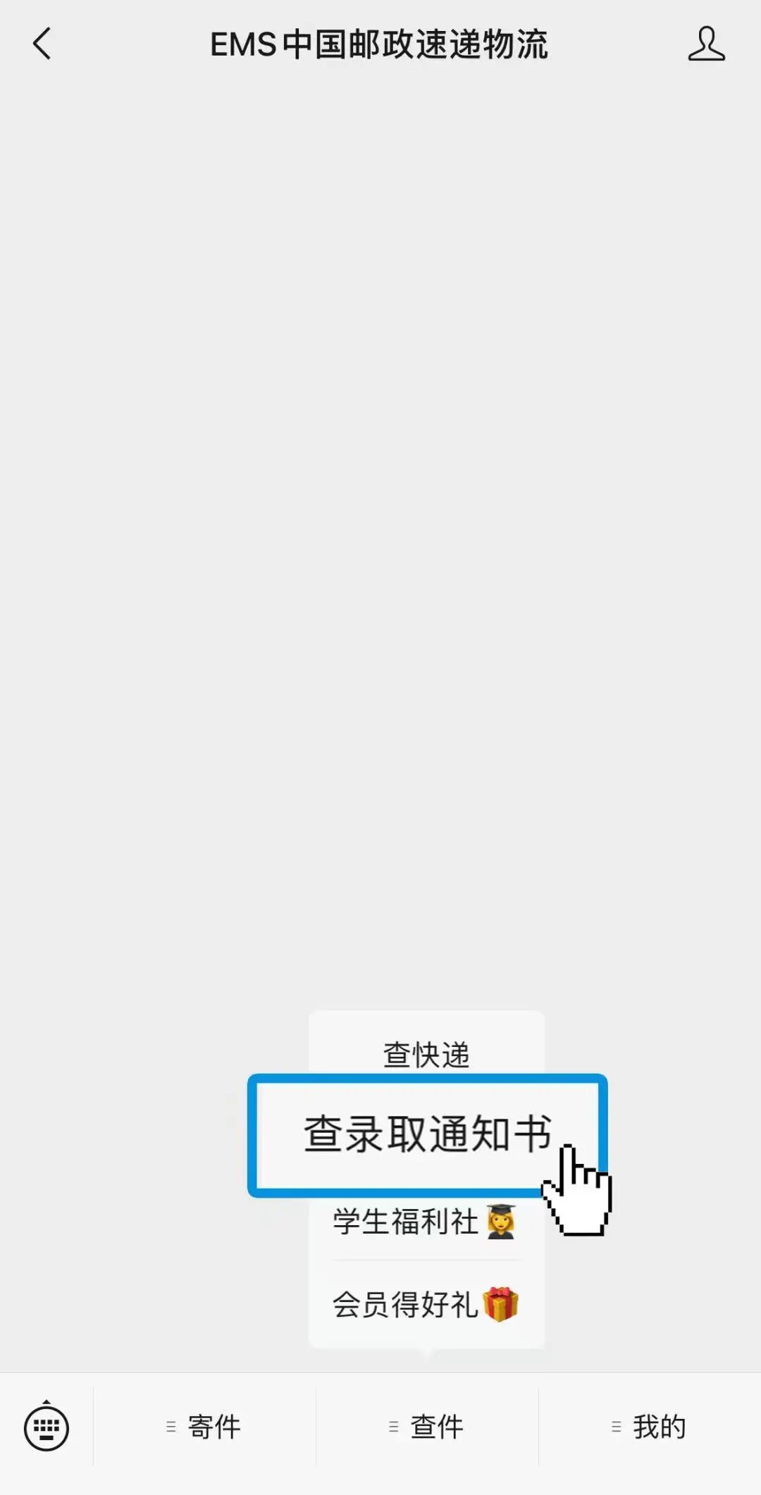 点击EMS公众号菜单栏「查件」-「查录取通知书」