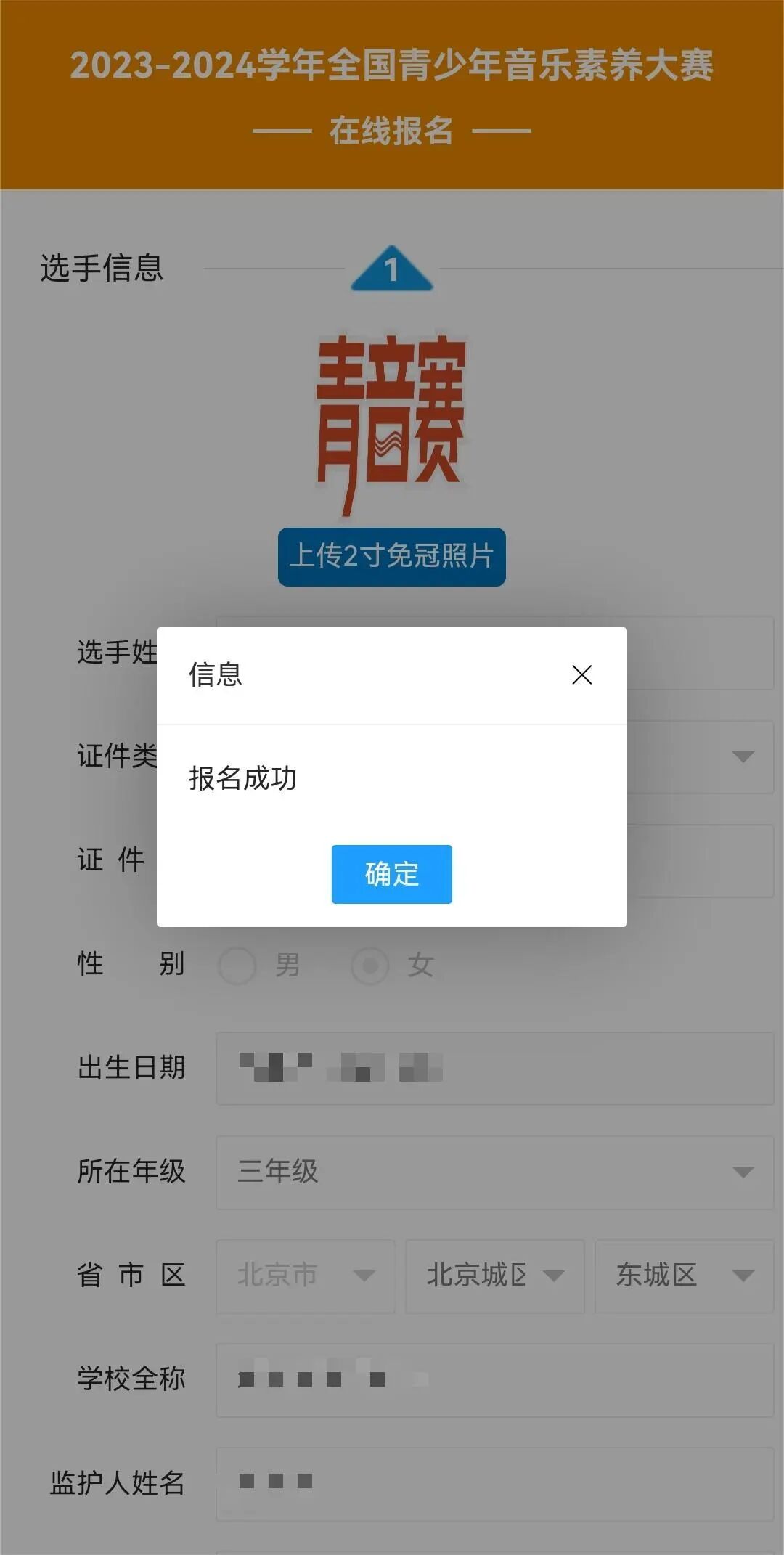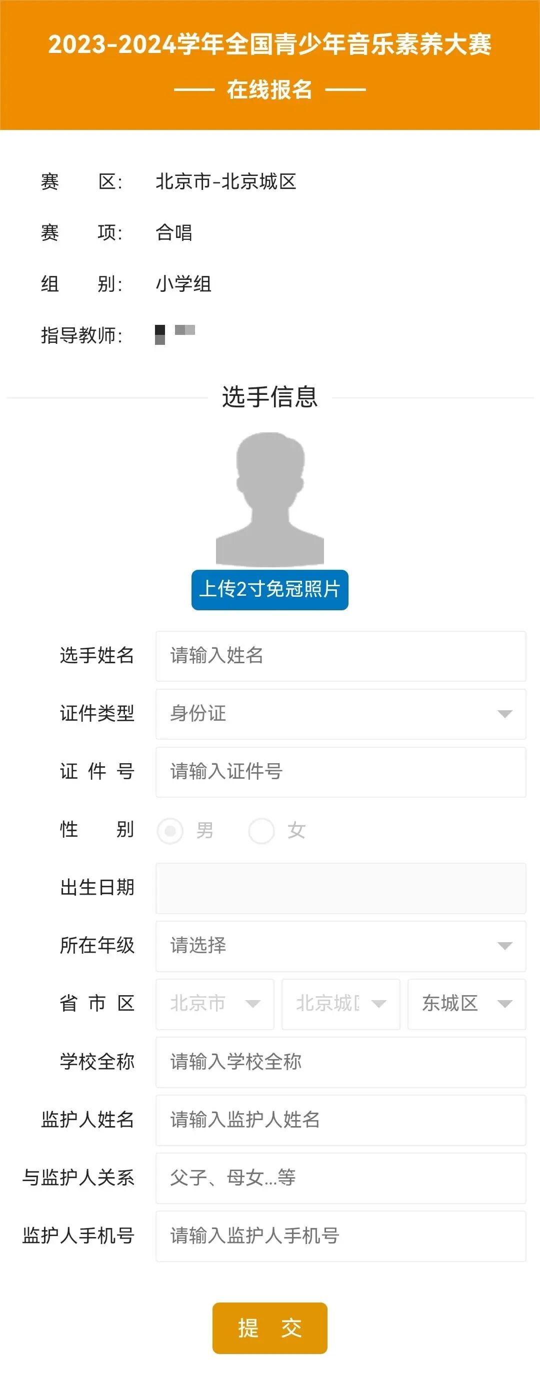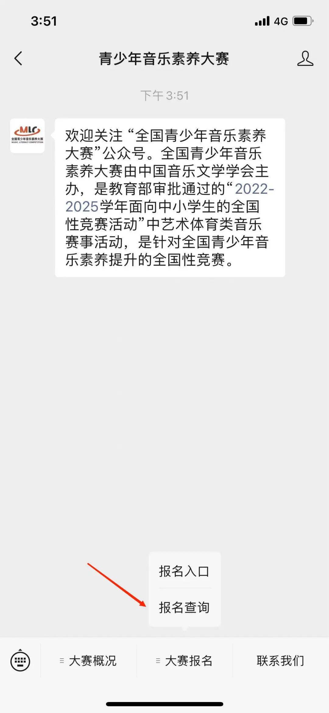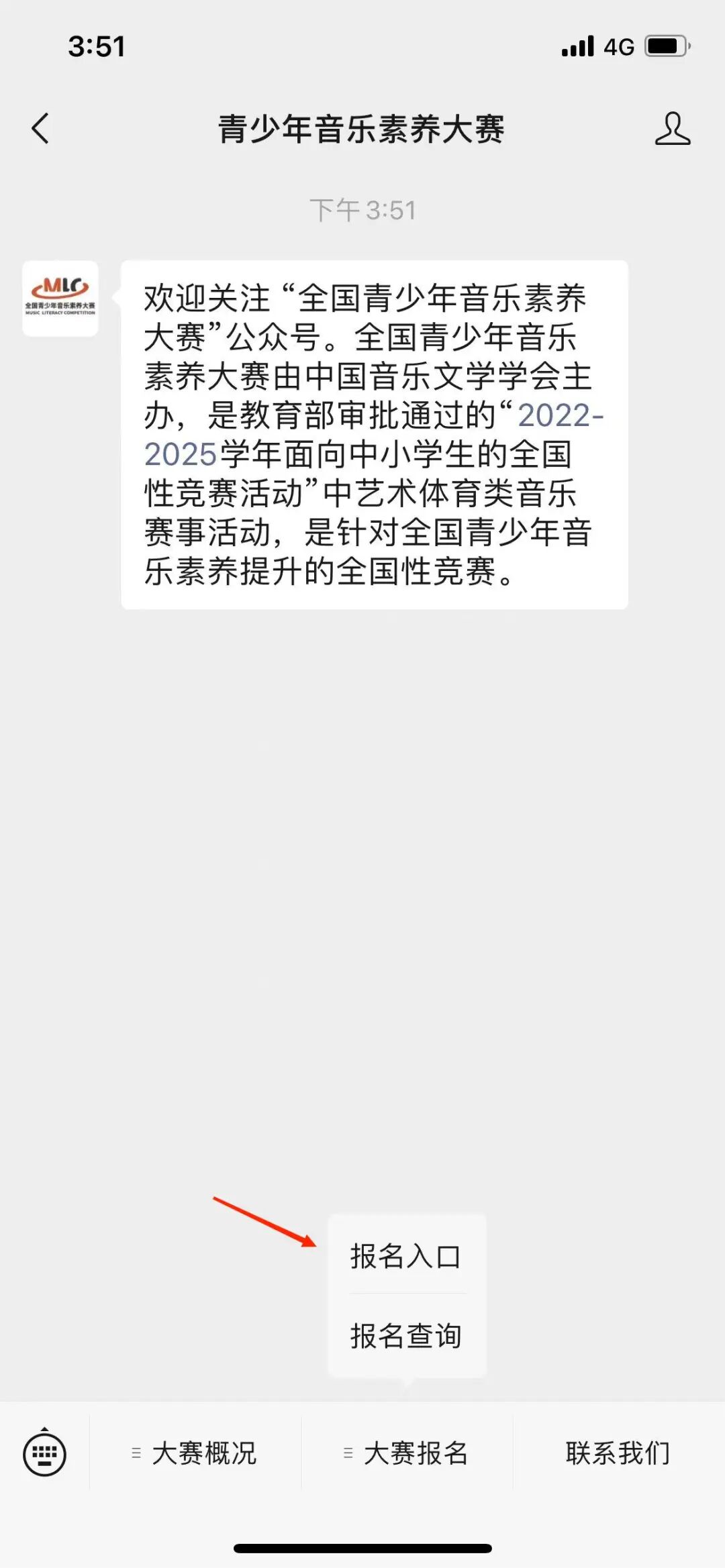 在报名期限内,选手登录“青少年音乐素养大赛”微信公众号规范填写并提交相关信息。