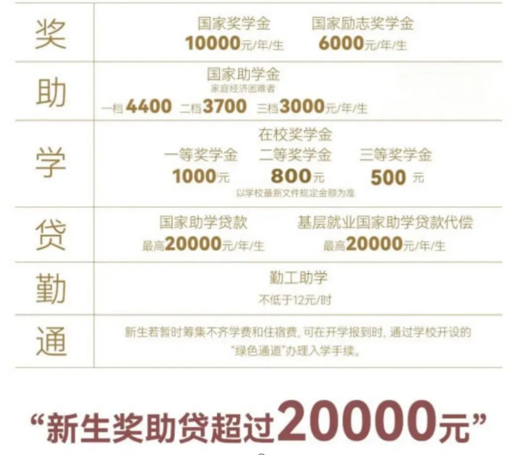 新生奖助贷超过20000元,涵盖国家奖学金、国家励志奖学金、国家助学金、国家助学贷款等多个类目。