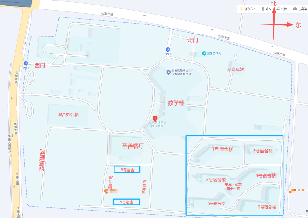 导航设置“长垣烹饪职业技术学院新校区”。需要注意,学生报到期间,校园外部车辆不得入校,为避免拥堵请自驾前往的家长不要在门口逗留太久。