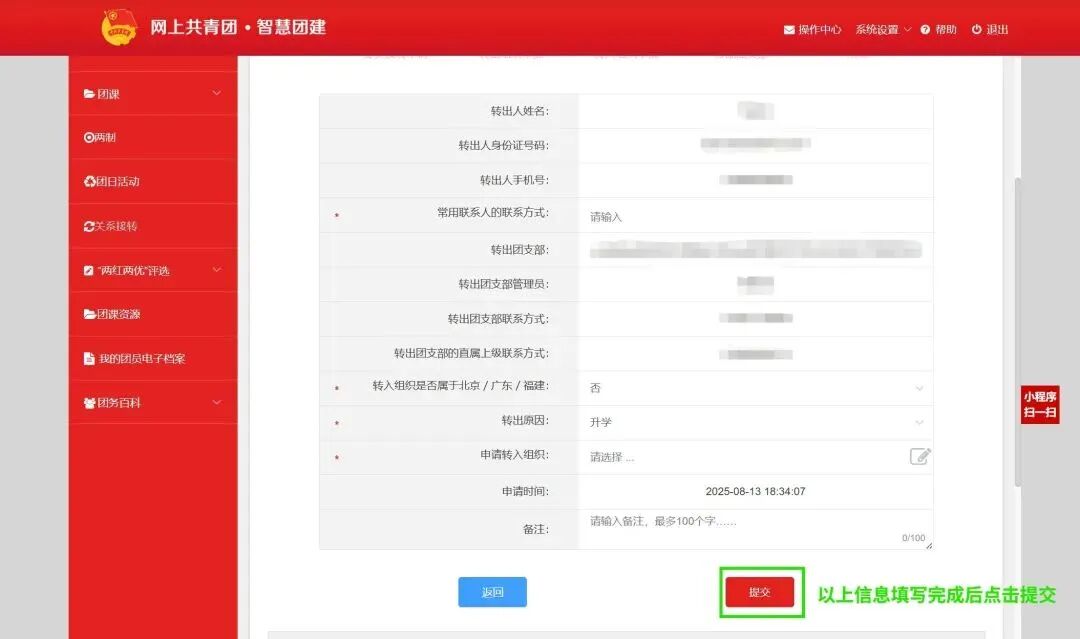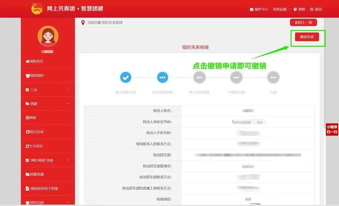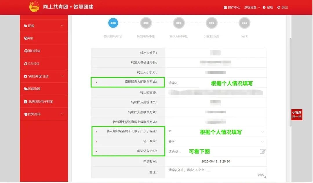 (2)在“智慧团建“系统上自行发起线上的团组织关系转接申请。(团员本人发起转接申请)