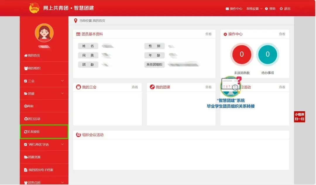 登录系统进入个人中心,点击“关系转接”选项,发起团组织关系转接。(图2绿色框内信息为必填项)