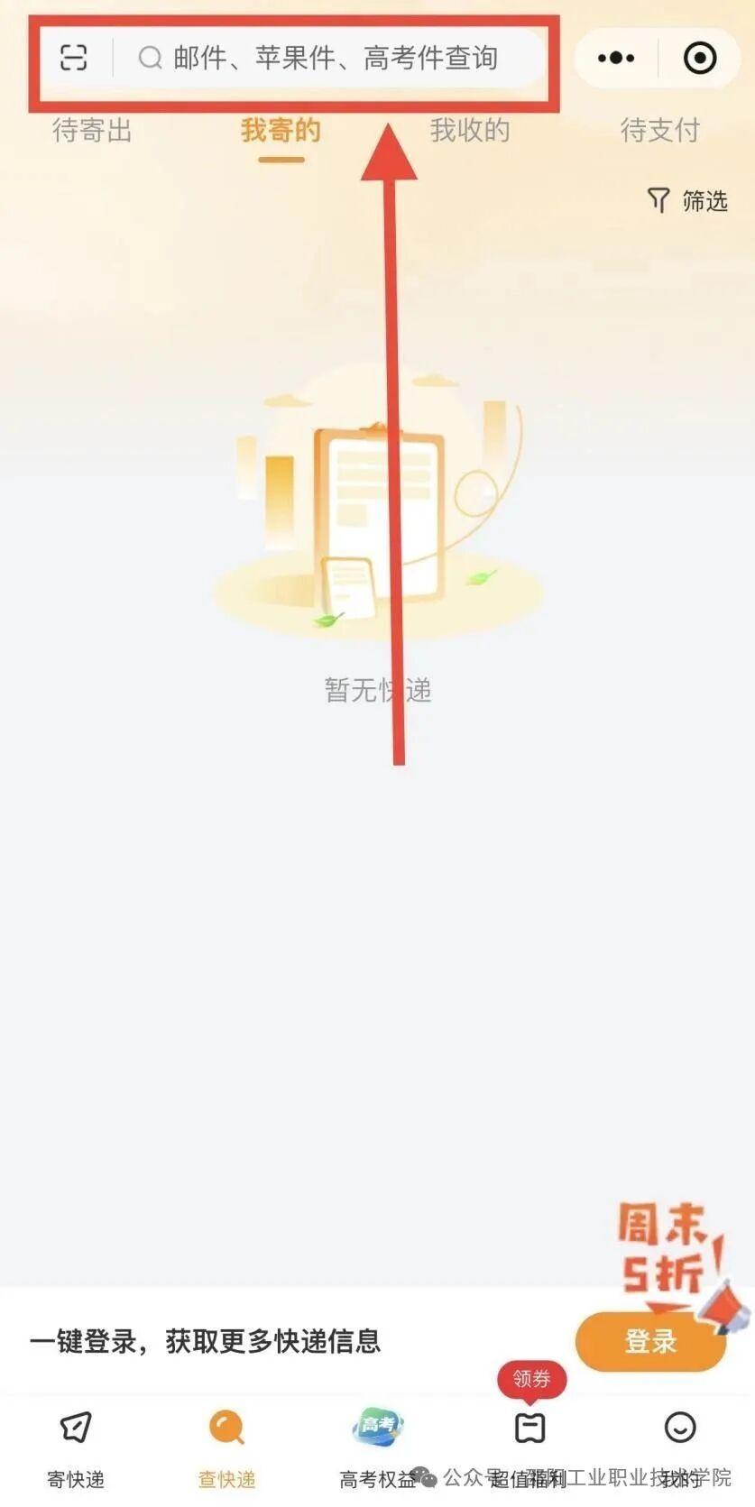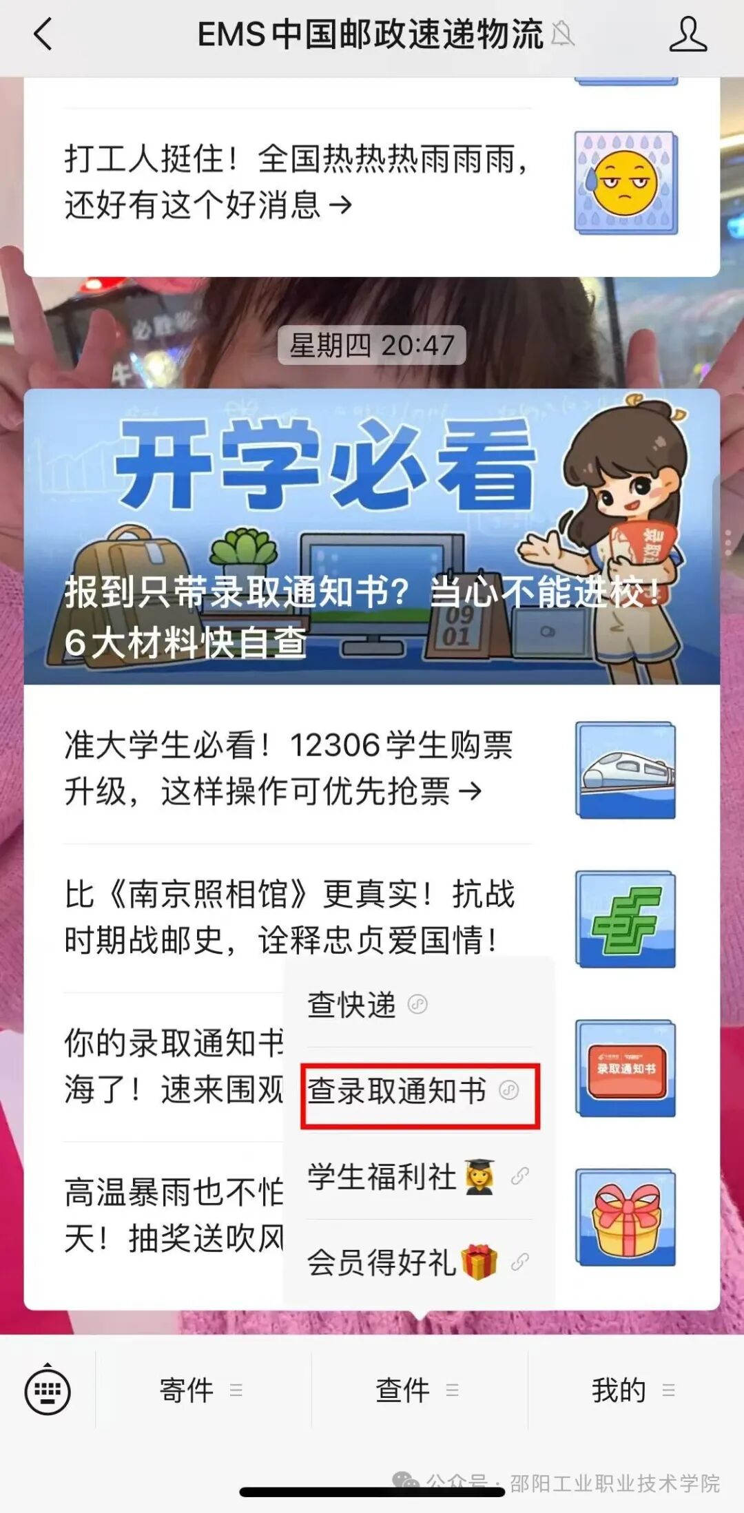 2、进入查询功能:进入公众号,点击底部菜单栏的“查件”,找到“查录取通知书”或“邮件查询”功能。
