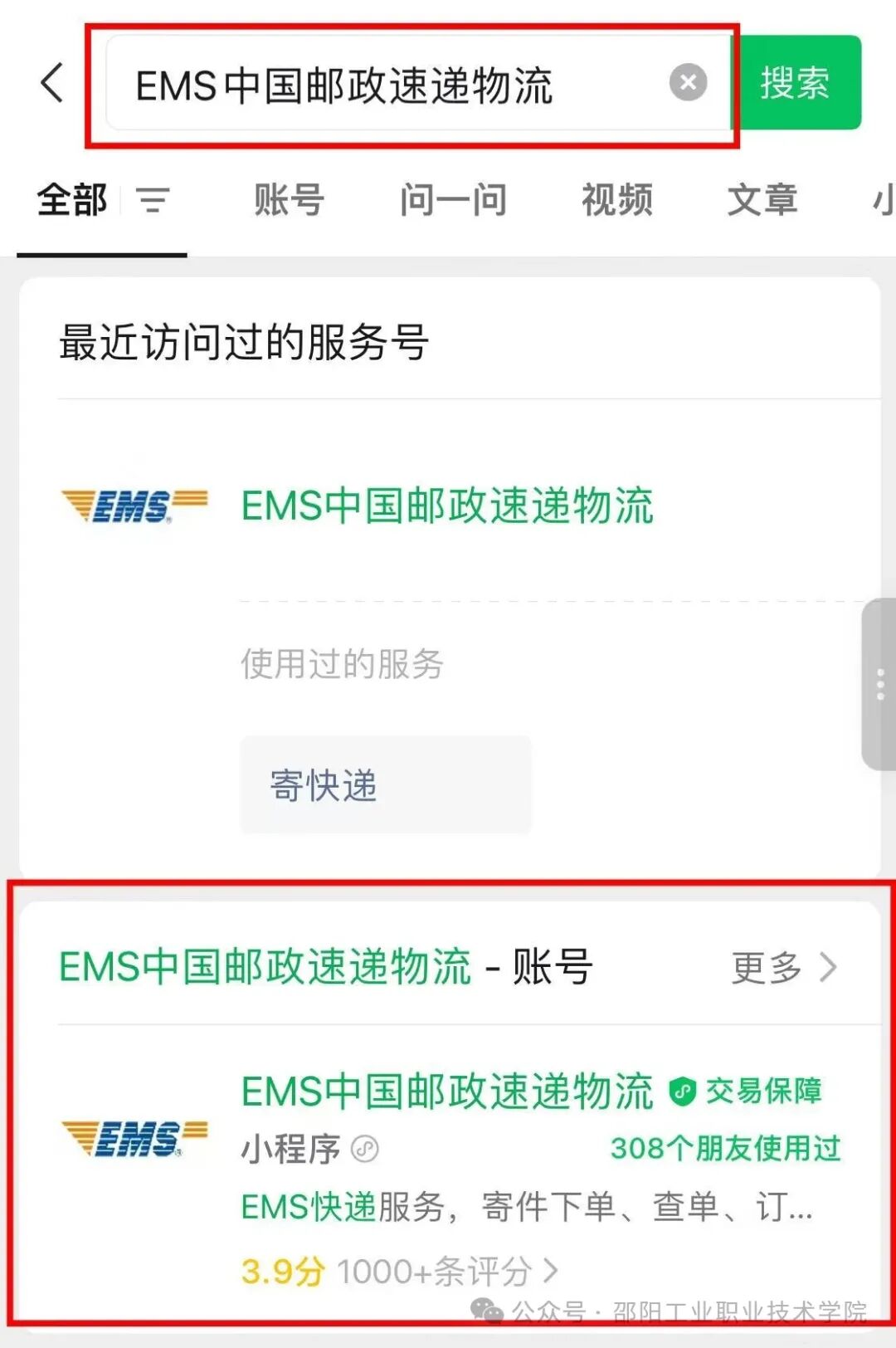 1、关注公众号:在微信中搜索并关注官方公众号“EMS中国邮政速递物流”。